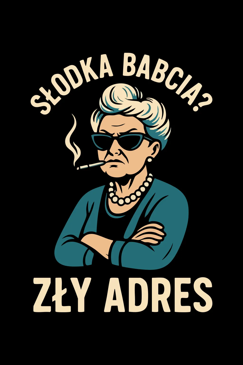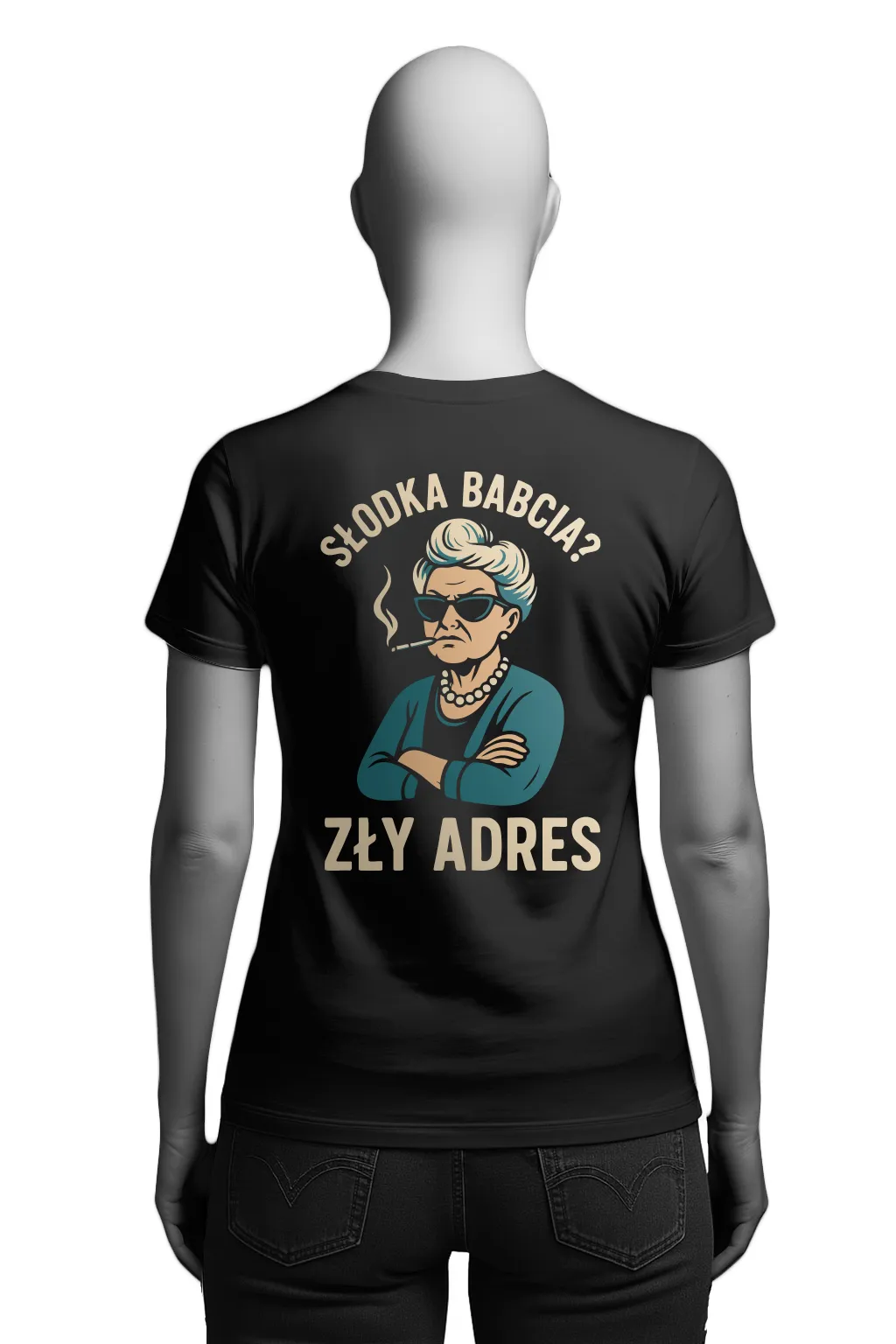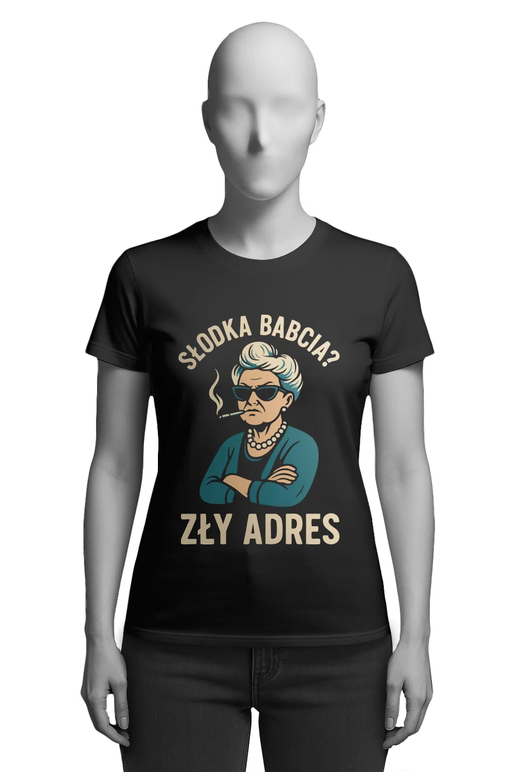 Widoczny, duży napis „Zły adres” oraz pytanie „Słodka babcia?” podkreślają przekorny humor projektu. To koszulka dla babci, która: