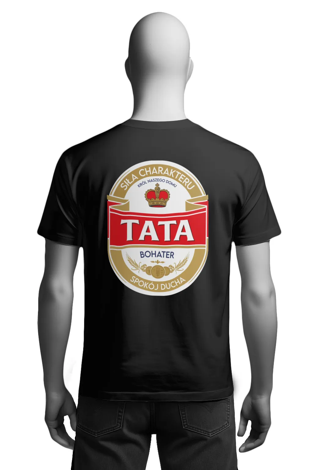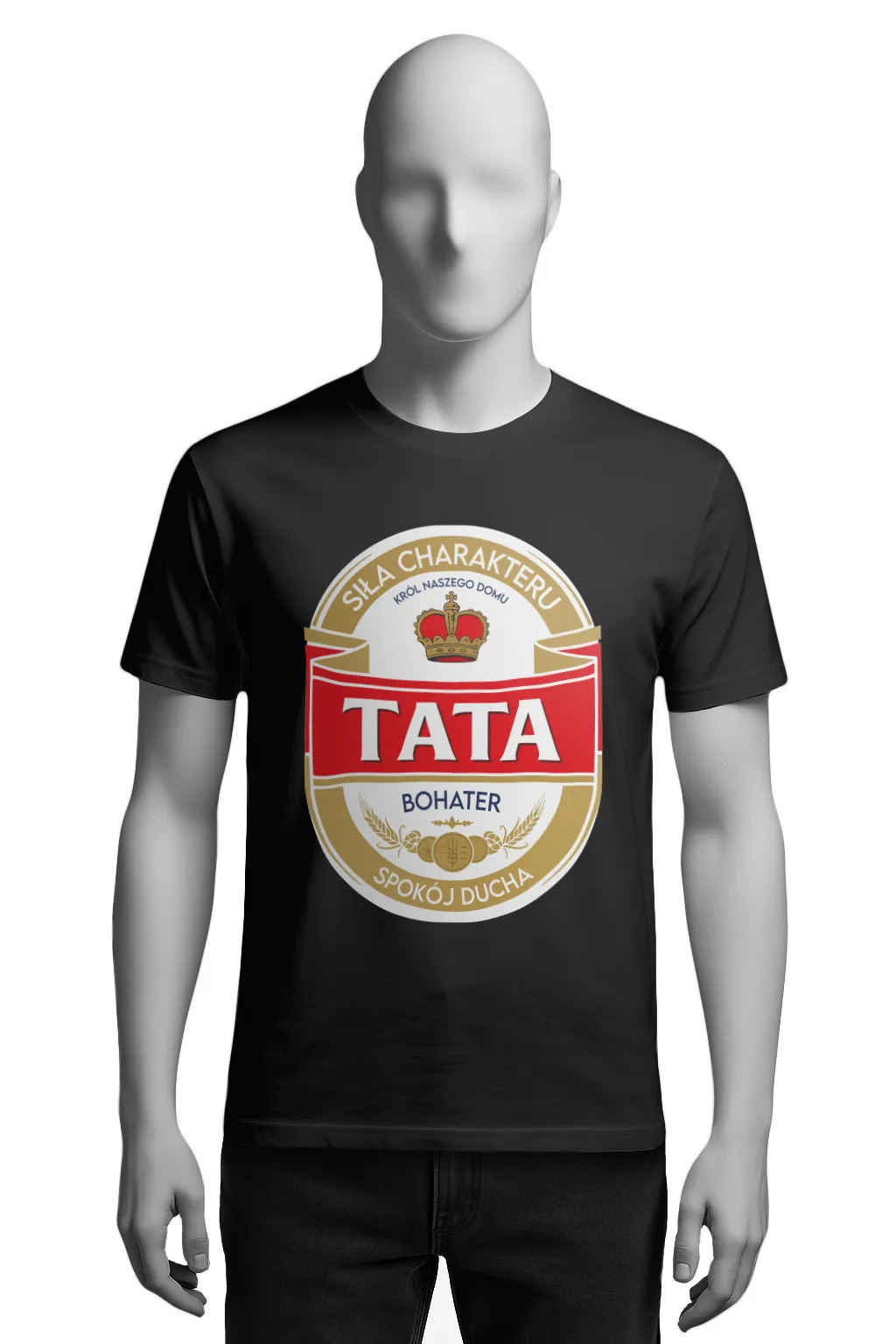 Ta koszulka to wariacja à la Tyskie – zamiast złocistego piwa mamy tu złotą koronę i czerwony napis „TATA”. Projekt łączy w sobie poczucie humoru, rodzinne ciepło i styl, który od razu przyciąga wzrok.