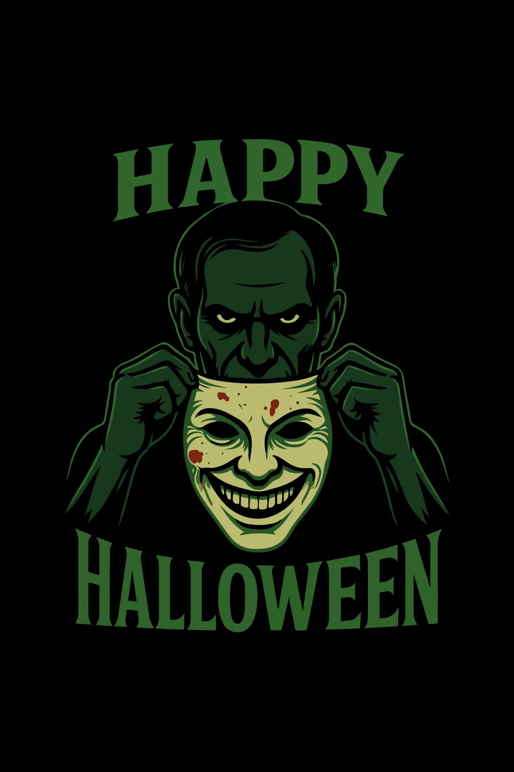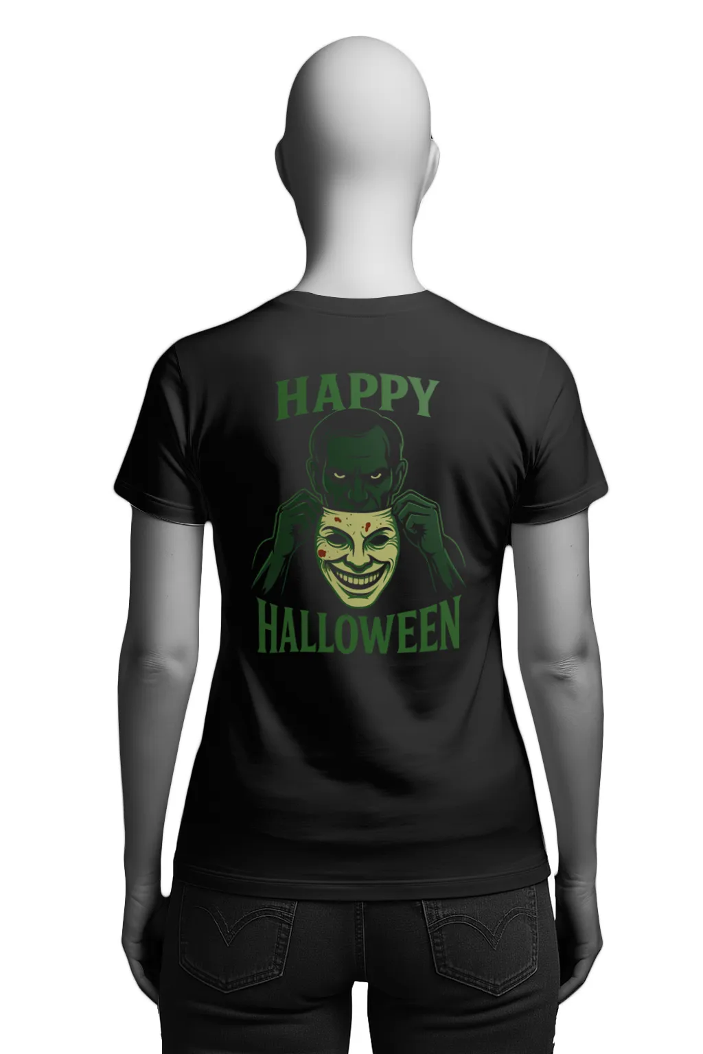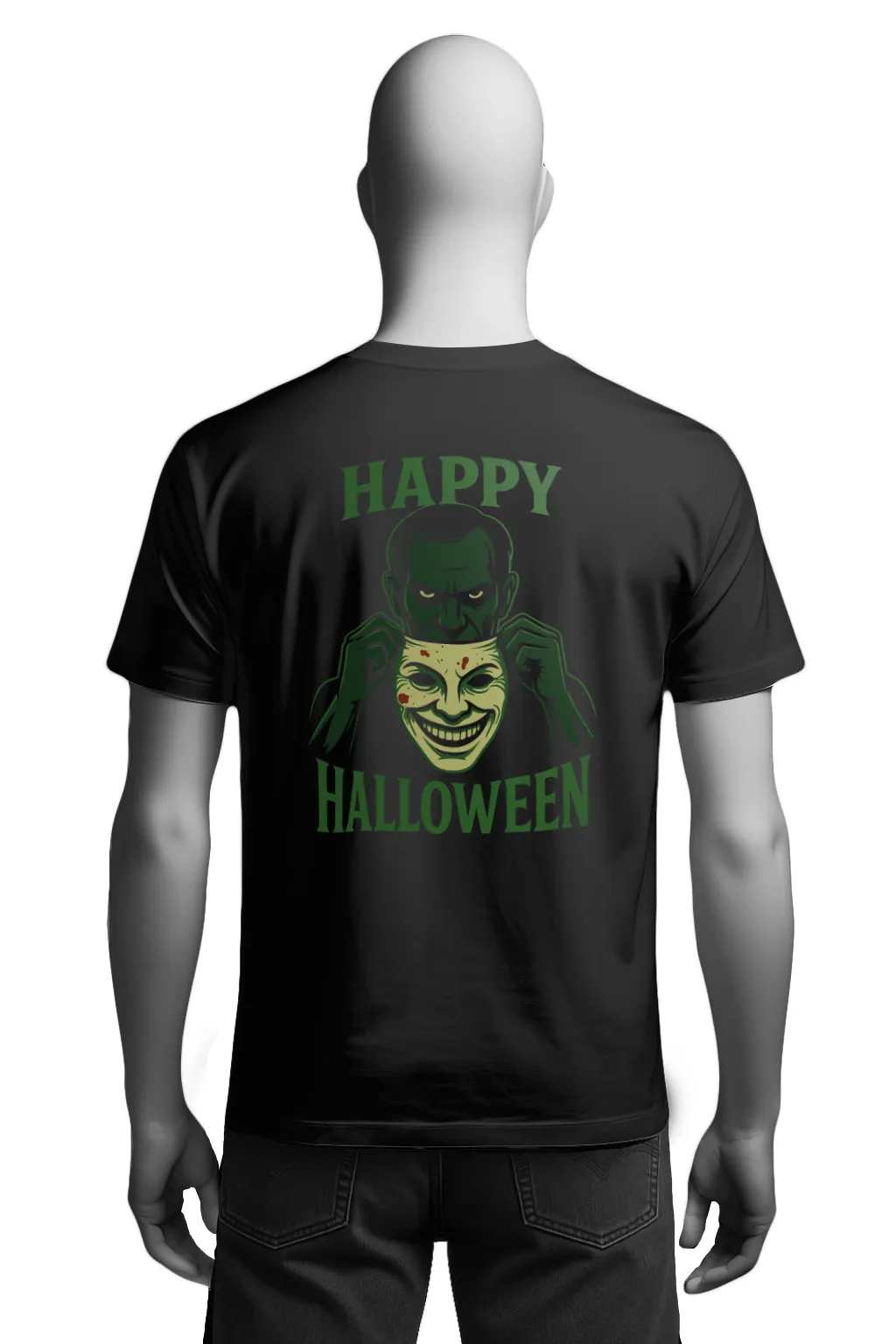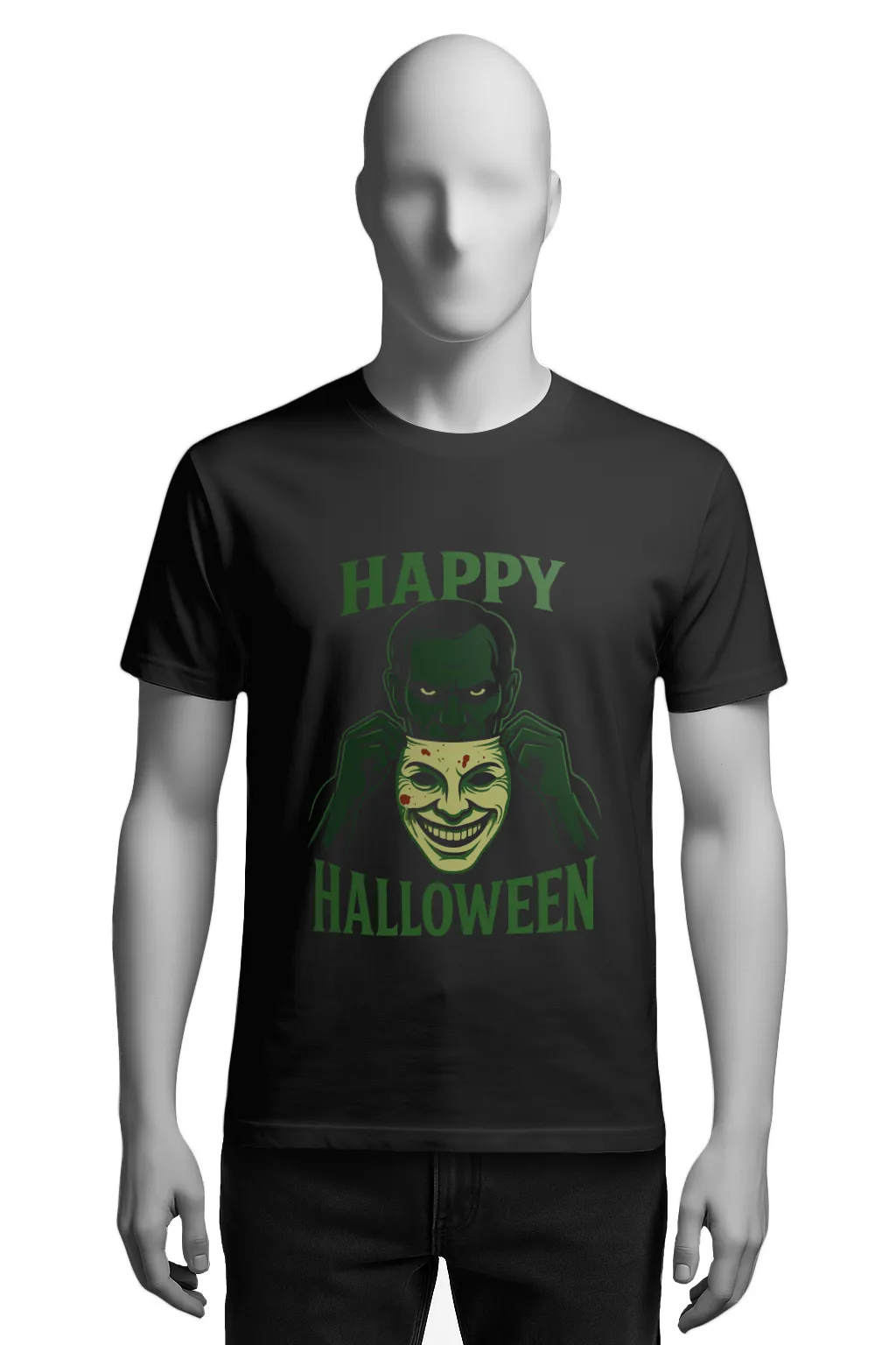 Koszulka „Happy Halloween” to propozycja dla tych, którzy lubią mroczny klimat i styl z nutą niepokoju. Grafika postaci zdejmującej maskę z przerażająco szerokim uśmiechem od razu przyciąga uwagę i jasno sugeruje, że w Halloween nic nie jest takie, jakim się wydaje. To wzór dla osób, które cenią grozę podaną w estetycznej, wyrazistej formie.