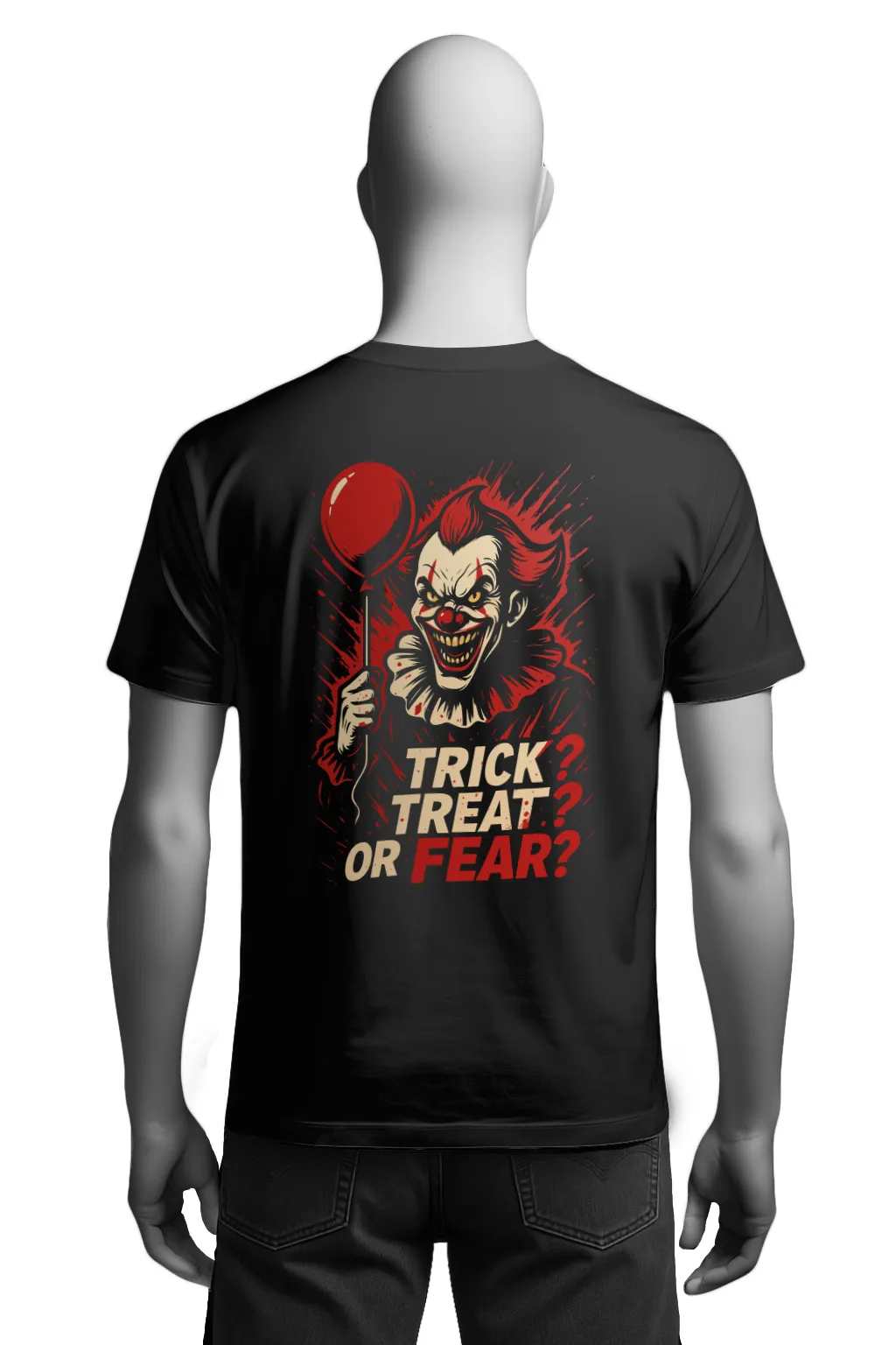 „Trick, Treat or Fear?” to koszulka inspirowana klasyką horroru i jedną z najbardziej ikonicznych postaci kina grozy. Demoniczny klaun z czerwonym balonem, złowrogi uśmiech i komiksowa kreska w stylu retro-horror tworzą nadruk, który od pierwszego spojrzenia budzi dreszcz emocji. To projekt dla tych, którzy cenią mocne motywy i nie boją się przyciągać uwagi.