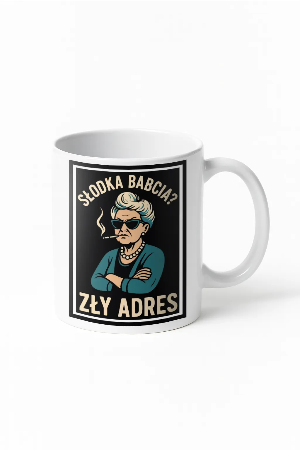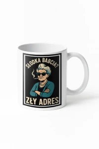 Ten kubek dla babci od razu komunikuje, że nie mamy do czynienia z klasycznym, grzecznym motywem. Na grafice widoczna jest charakterna babcia w stylu retro, z krótkimi siwymi włosami, okularami przeciwsłonecznymi, perłowym naszyjnikiem oraz papierosem w ustach. Skrzyżowane ręce i poważny wyraz twarzy idealnie współgrają z napisem „Słodka babcia? Zły adres”, który stanowi główny element przekazu.